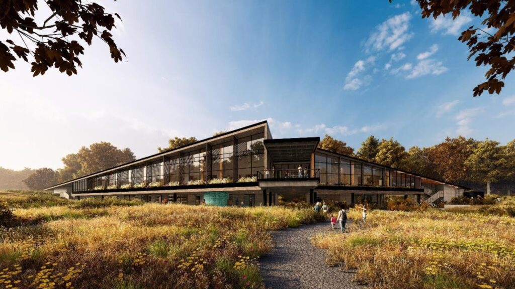 It will also incorporate the center’s sustainable technical features, including solar panels that generate more energy than the building uses; rainwater collection and purification for drinking, cooking and restrooms; a small-scale wind turbine; and a green roof that will filter rainwater and help insulate the building. Large windows in classrooms and a common area will provide natural light, passive heating in winter, and sweeping views of the forest. The roof will extend to cover three outdoor learning areas.