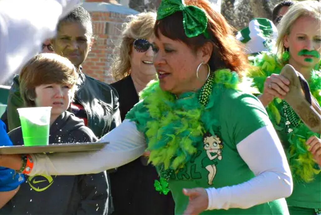 “You have to take a tray of six cups of green beer around the course and return with as many still full as possible,” says Hickox. “You and your teammates have to race with vigor and stability to get from one end of the start line and back, passing the tray with as much agility as possible.”