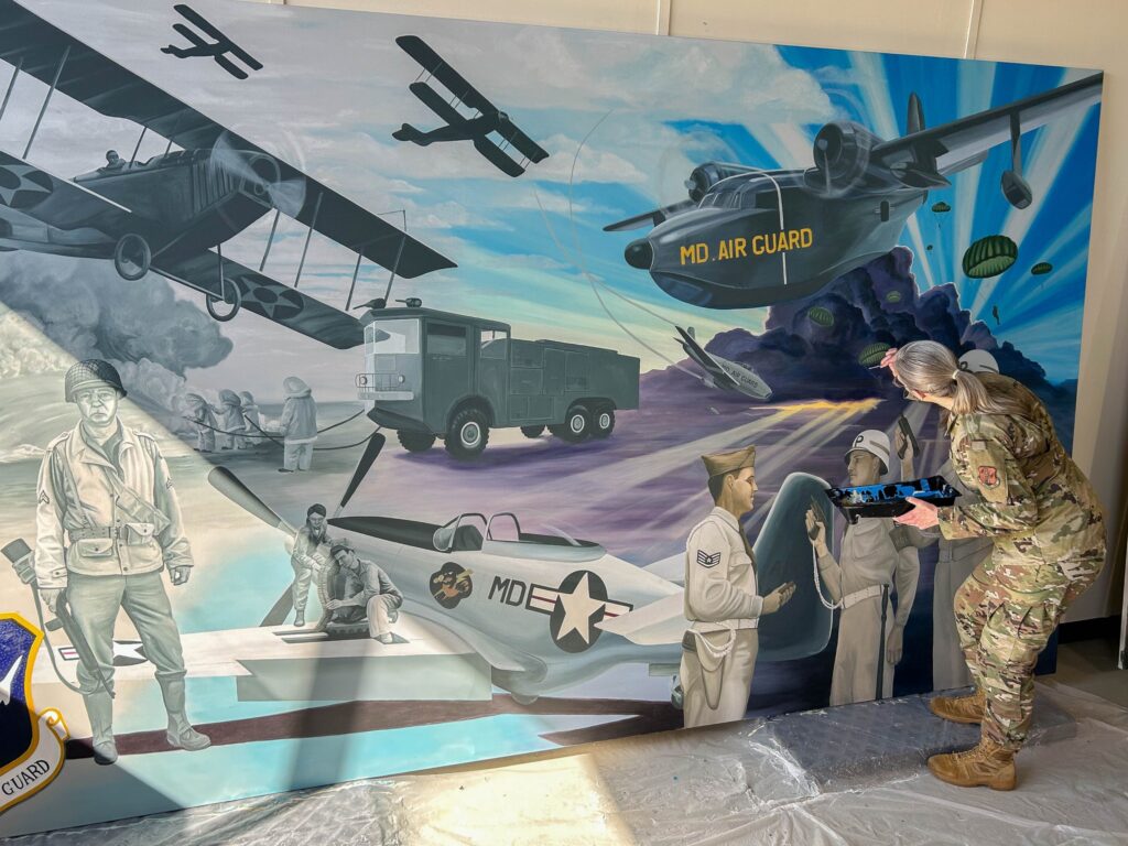 Maryland Air National Guard Staff Sgt. Rachel Underwood, public affairs specialist for the 175th Wing, helped commemorate the Maryland Air National Guard’s flying history with a three-panel mural hung at Warfield Air National Guard Base at Martin State Airport. She also painted a ceiling tile to be displayed at the National Guard Heritage Room at Patton Hall, Ft. Myer, Virginia.