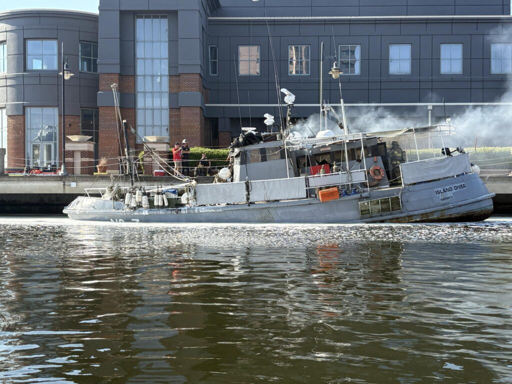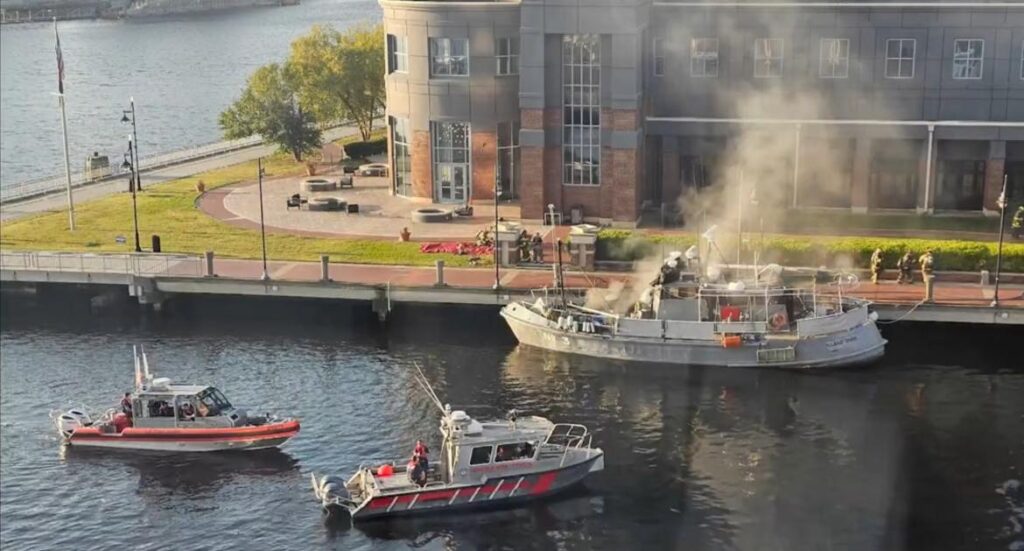 Damage from the fire caused the vessel to sink, and as of Tuesday, Sept. 9, the nearby Elizabeth River Ferry’s North Landing dock remained closed to ferry service. “Customers going to and from Portsmouth, as well as those going to Harbor Park may board at the High St. dock,” said an alert from Hampton Roads Transit.